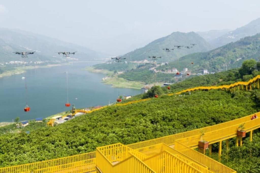 Drones passam a fazer o trabalho mais duro em plantações nas montanhas da China, retiram laranjas de pomares em encostas, aceleram a saída da safra até pontos de carga e reposicionam a logística rural no trecho onde o caminhão não chegava com eficiência