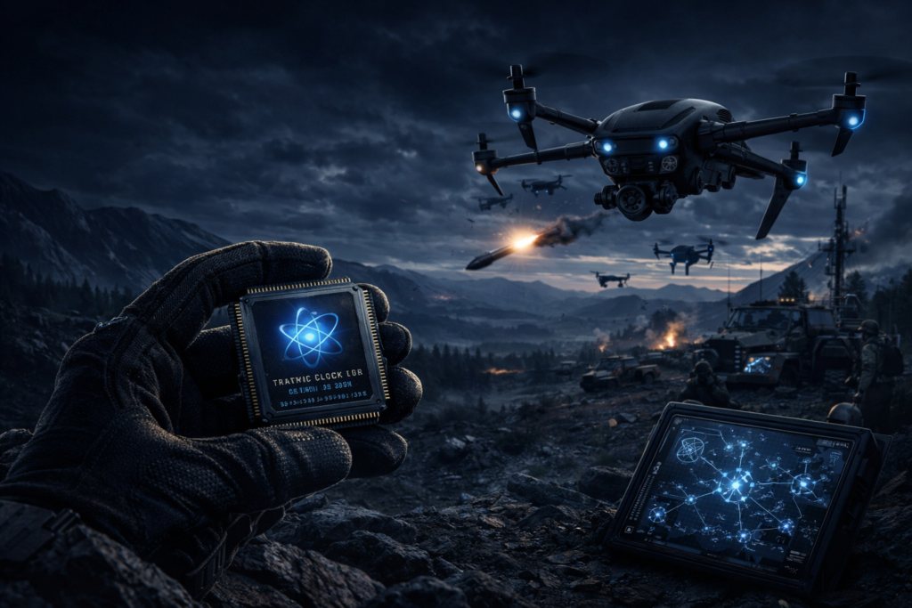 Um dos maiores desafios para drones militares é a dependência de sistemas de navegação por satélite. Em cenários de guerra, sinais de GPS podem ser bloqueados ou manipulados, comprometendo completamente a missão.Com o uso de relógios ultra precisos, os drones podem utilizar métodos avançados de navegação baseados em cálculo de posição ao longo do tempo, reduzindo a necessidade de sinais externos. Isso significa que um drone pode continuar operando mesmo em ambientes com forte interferência eletrônica, tornando-se muito mais autônomo e resistente.Essa capacidade é considerada estratégica, pois permite operações em áreas onde antes seria arriscado ou impossível utilizar drones com segurança.